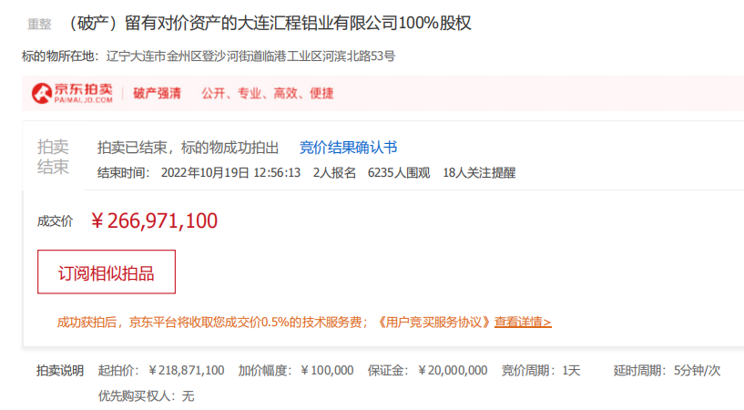 本次拍賣的標的為匯程鋁業100%股權,起拍價為2.188711億元,經過227次出價,最終由大連德泰控股有限公司( 簡稱“德泰控股”) 旗下的大連德泰資產運營管理有限公司拍得。